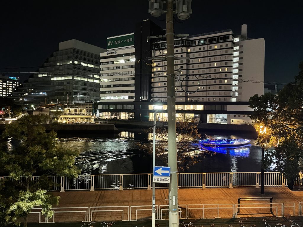 博多中川の川縁にある老舗居酒屋官兵(黒田官兵衛 福岡ゆかりの武将)から観える景色です。遊覧船が運行してます。