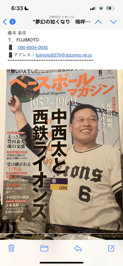 5月にお亡くなりになった中西太氏、実は高校時代私は野球部に所属していました。高松一高、そう、中西太氏の後輩です。コロナ前には毎年7月新宿で関東一高野球部のOB会が行われていました。思い返せば小学生の時、高松市営野球場のオープン戦の時、試合後西鉄監督の中西太氏か観覧席の私に硬球ボールを投げて下さり、プレゼントして頂いたのを鮮明に覚えています。中西太先輩のご冥福をお祈り申し上げます。