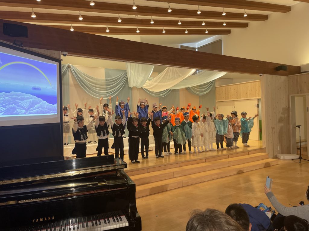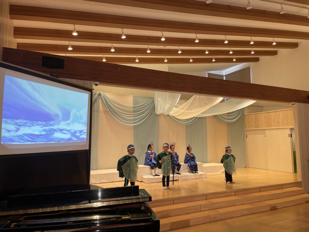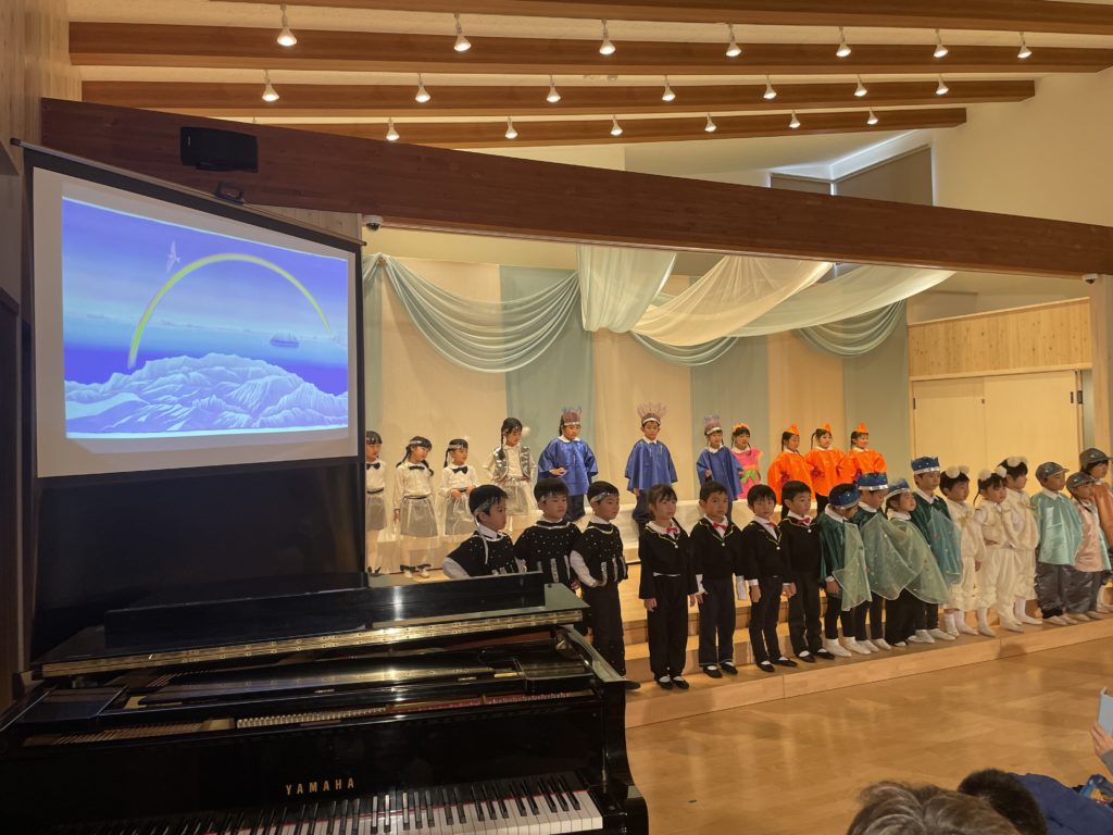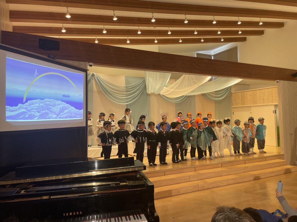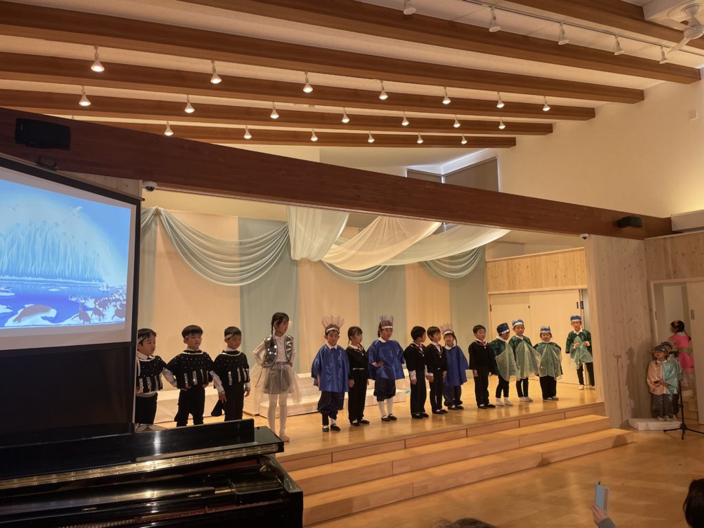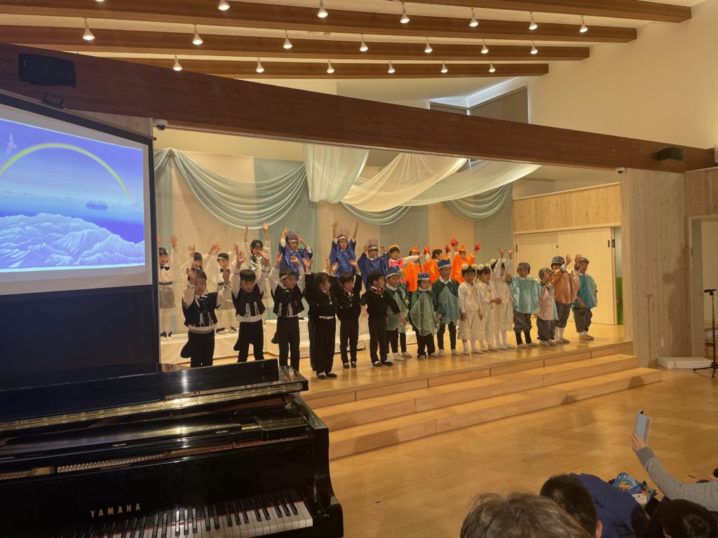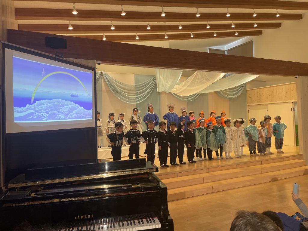 昭島市の保育園の音楽会が今年最後の仕事でした。音楽会は最初にミュージカル、そしてハーモニカ演奏、合奏、うたです。ミュージカルは、高円宮妃久子殿下・文/飛鳥童氏・絵/藤本和道・作曲の「氷山ルリの大航海」です。この作品が出来て以来24年間毎年園の音楽会で発表してきました。来年度は25回目の節目を迎えます。なんとも凄い偉業です。今日の音楽会で今年の仕事は終わりました。